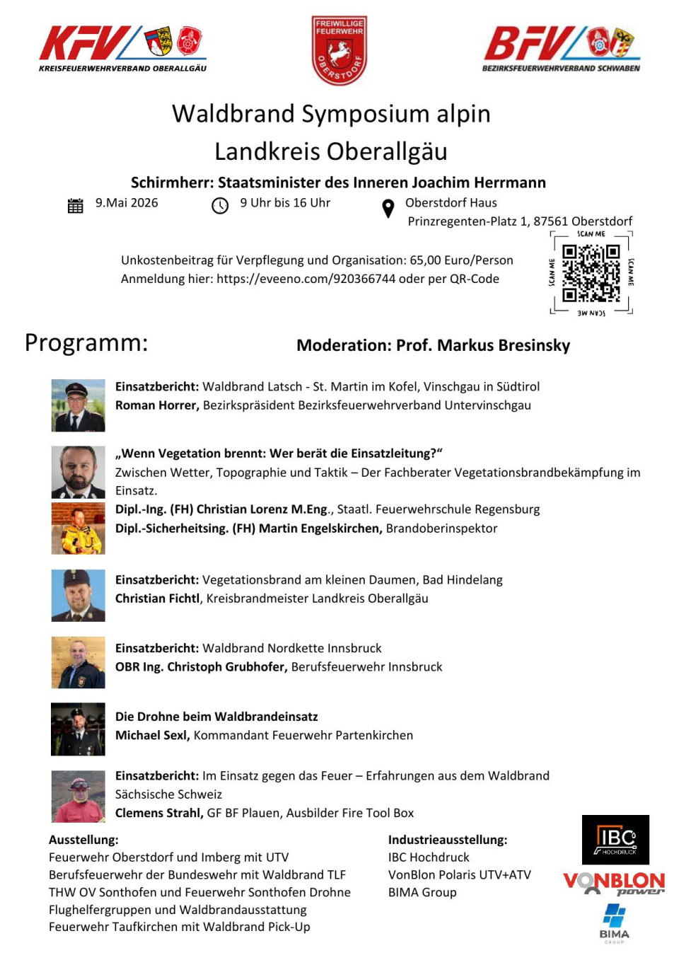 Oberstdorf – Am 9. Mai 2026 findet im Oberstdorf Haus das Waldbrandsymposium Alpin des Landkreises Oberallgäu statt. Die Veranstaltung bringt Feuerwehr, Einsatzkräfte, Fachberater, Behörden und Experten aus dem gesamten Alpenraum zusammen, um aktuelle Entwicklungen, Einsatzerfahrungen und neue Technik in der Vegetationsbrandbekämpfung zu diskutieren.